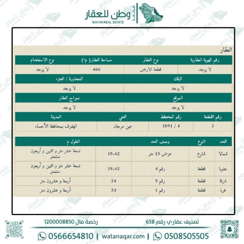 المساحة 466م شارع عرض 15 الإتجاه: شمال الأطوال: 19.42 × 24 السعر: 750,000 ريال ملاحظات ملاحظة: السعر غير شامل الضريبة والسعي رخصة فال 1200008850 - المشاهدات: 93