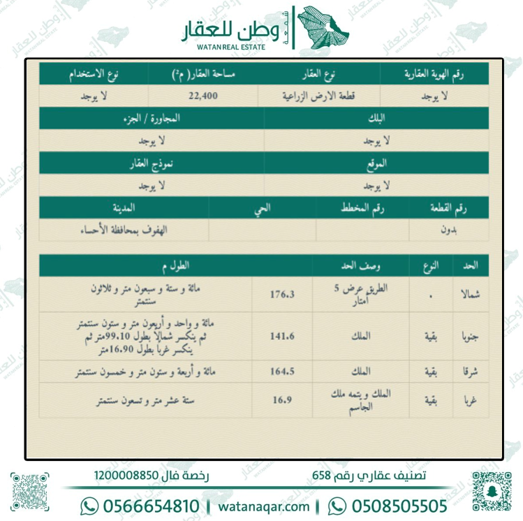 المساحة 22,400م - الصك الكتروني - يوجد بها 2 عين - يوجد فيها كهرباء - يوجد فيها نخيل وأشجار - فيها بعض المباني القديمة على السوم ملاحظات ملاحظة: السعر غير شامل الضريبة والسعي رخصة فال 1200008850 - المشاهدات: 99