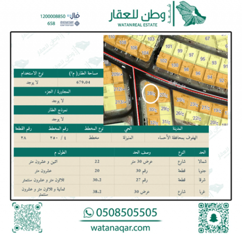 المساحة 679م شارع عرض 30 * 30 الإتجاه: شمال * غرب على السوم ملاحظات ملاحظة: السعر غير شامل الضريبة والسعي رخصة فال 1200008850 - المشاهدات: 23